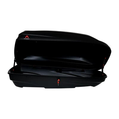 Über Aufsteller lässt sich die matt-schwarze Dachbox beidseitig öffnen und nutzerfreundlich beladen. Beiliegende Spanngurte verhindern ein Verrutschen des Gepäcks.