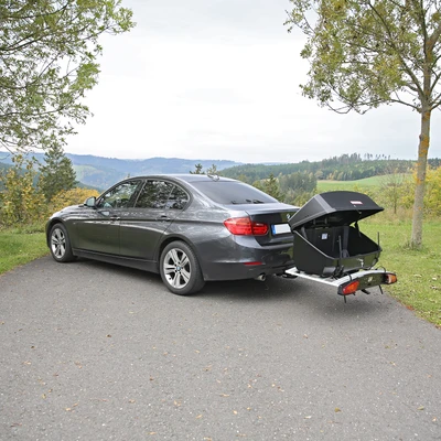 Die Transportbox hat ein Eigengewicht von ca. 7 kg. Eine Zuladung ist bis zu 30 kg möglich. Man kommt problemlos an das Gepäck im Kofferraum, da die Abklappfunktion des Alcor Fahrradträgers auch bei montierter Box funktioniert.