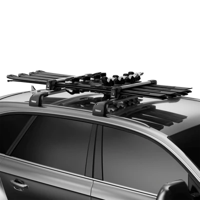 Der Skiträger verfügt über eine breite Öffnungstaste, wodurch das Entriegeln auch mit dicken Skihandschuhen möglich ist. Das integrierte Vertikalfedersystem ermöglicht den Transport dickerer Ski oder Snowboards. Dieses System verringert zusätzlich die Höhe des unbeladenen Trägers. Der Skiträger kann mit den beiliegenden Füßen um 29 mm erhöht werden, damit keine Beschädigungen durch hohe Skibindungen, am Fahrzeugdach entstehen. Nach dem Erhalt kann der Thule SnowPack 4 sofort eingesetzt werden, da die einfache Montage, auf jedem Dachträger mit Aluschienenprofil, in Sekundenschnelle erledigt ist. Mit dem unter „passendes Zubehör“ erhältlichen Befestigungssatz für Vierkantprofile ist der SnowPack 4 auch für Dachträger ohne T-Nut geeignet.